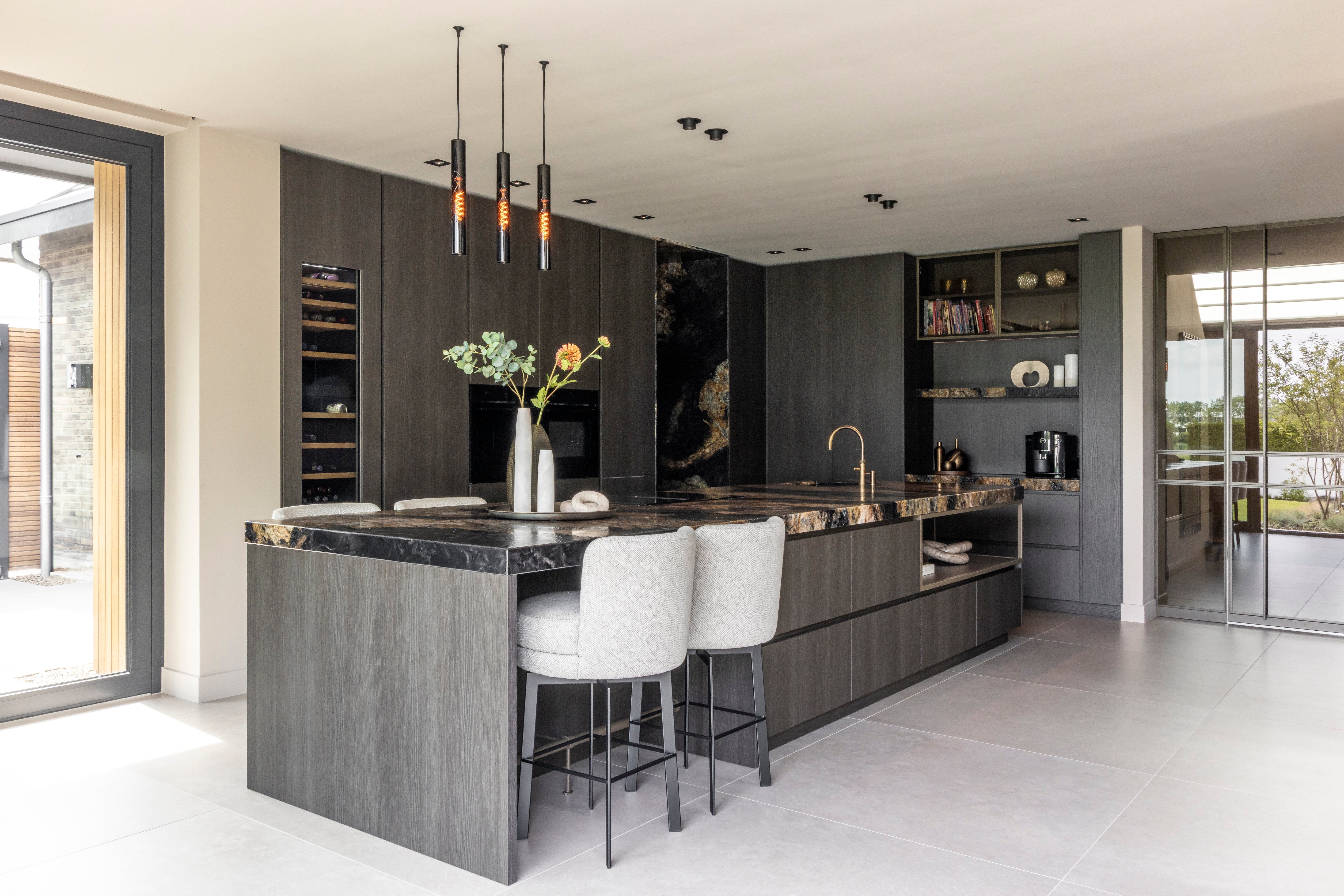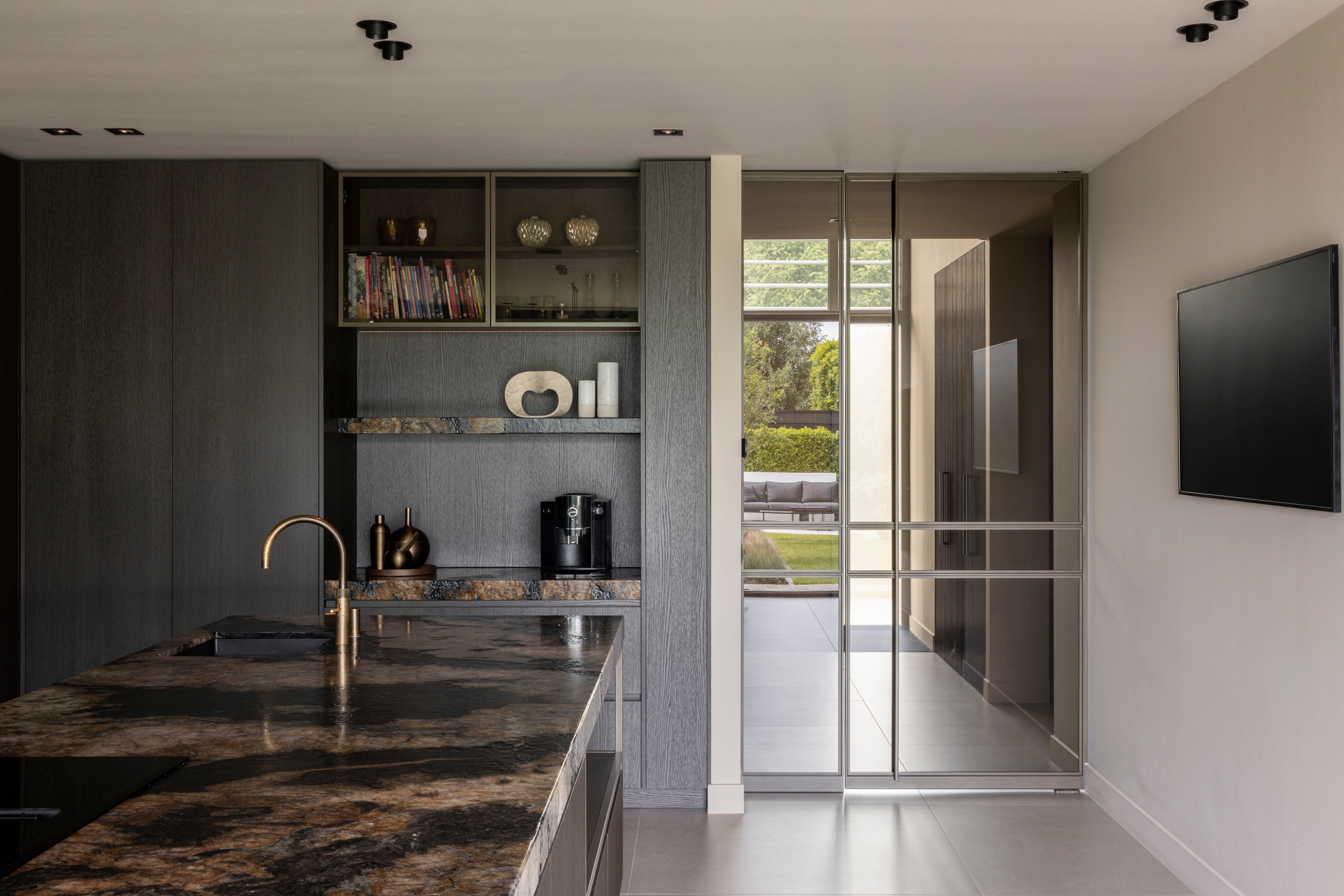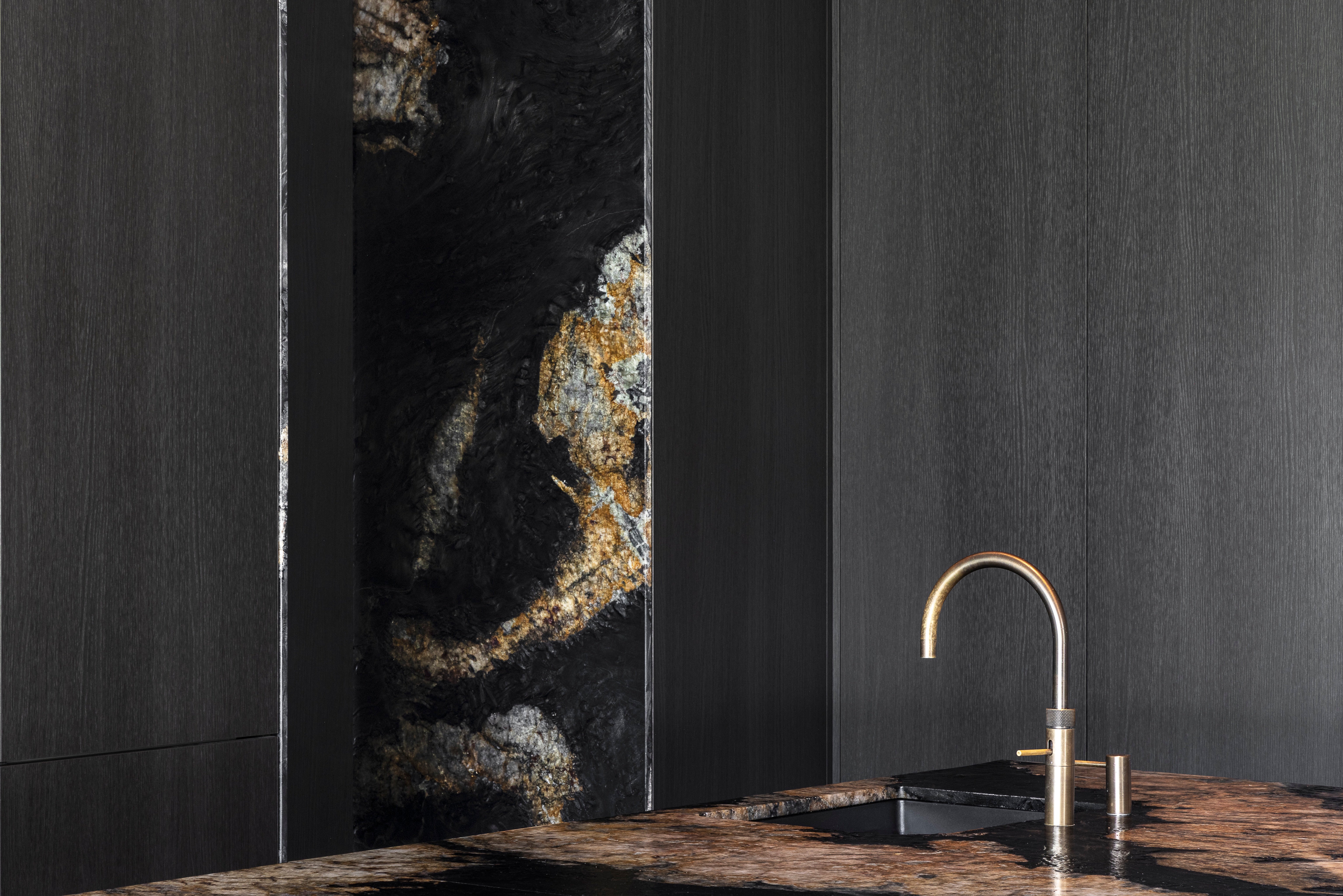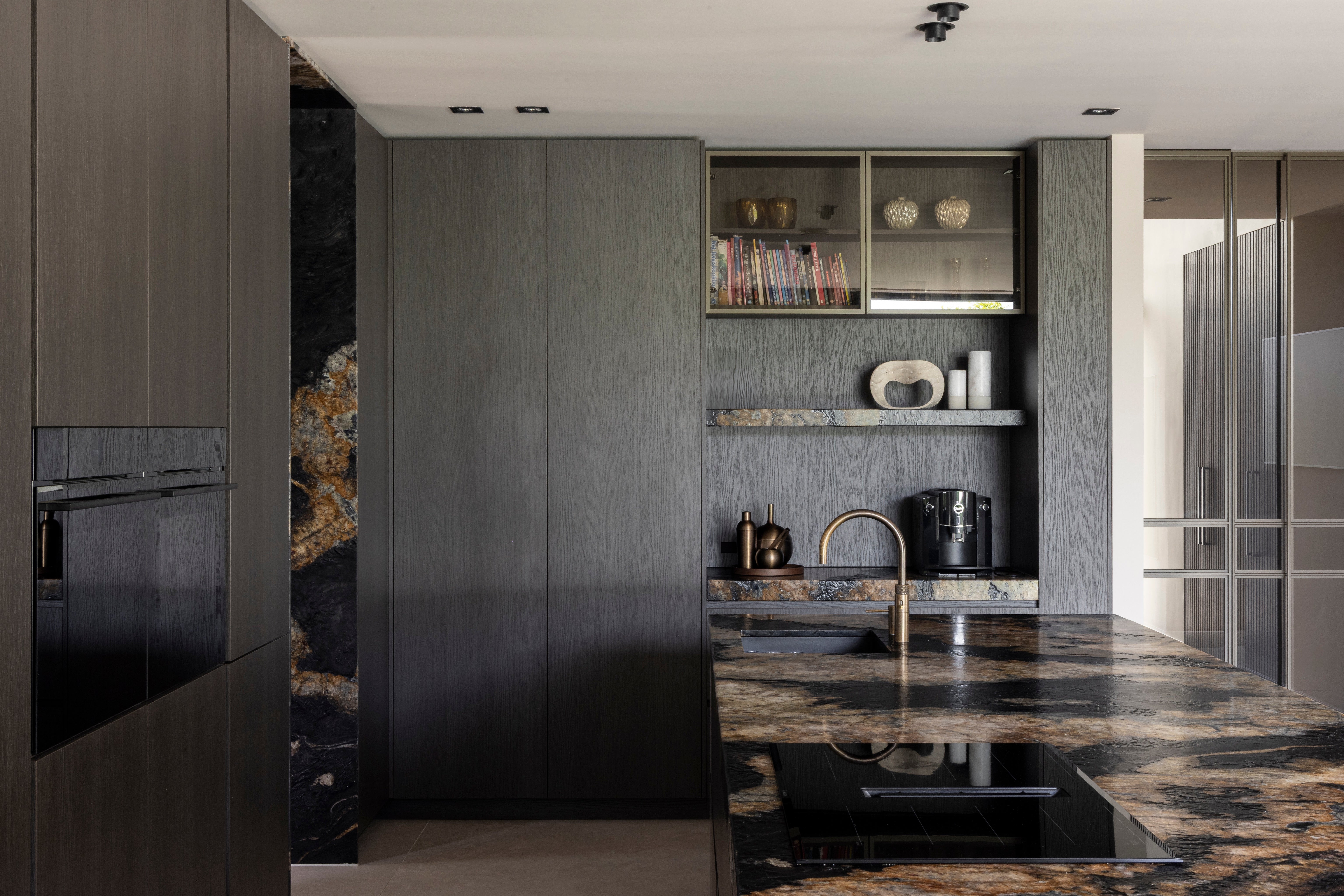 In deze luxe villa in Wilnis vormt Belatrix kwartsiet het stralende middelpunt van de keuken. Het diepe, donkere kleurenpalet met gouden en grijze aders creëert een rijke, bijna dramatische uitstraling die perfect aansluit bij het maatwerk interieurontwerp van MVD Interior. Het royale kookeiland en de doorlopende achterwand laten het unieke karakter van het gesteente maximaal tot zijn recht komen.