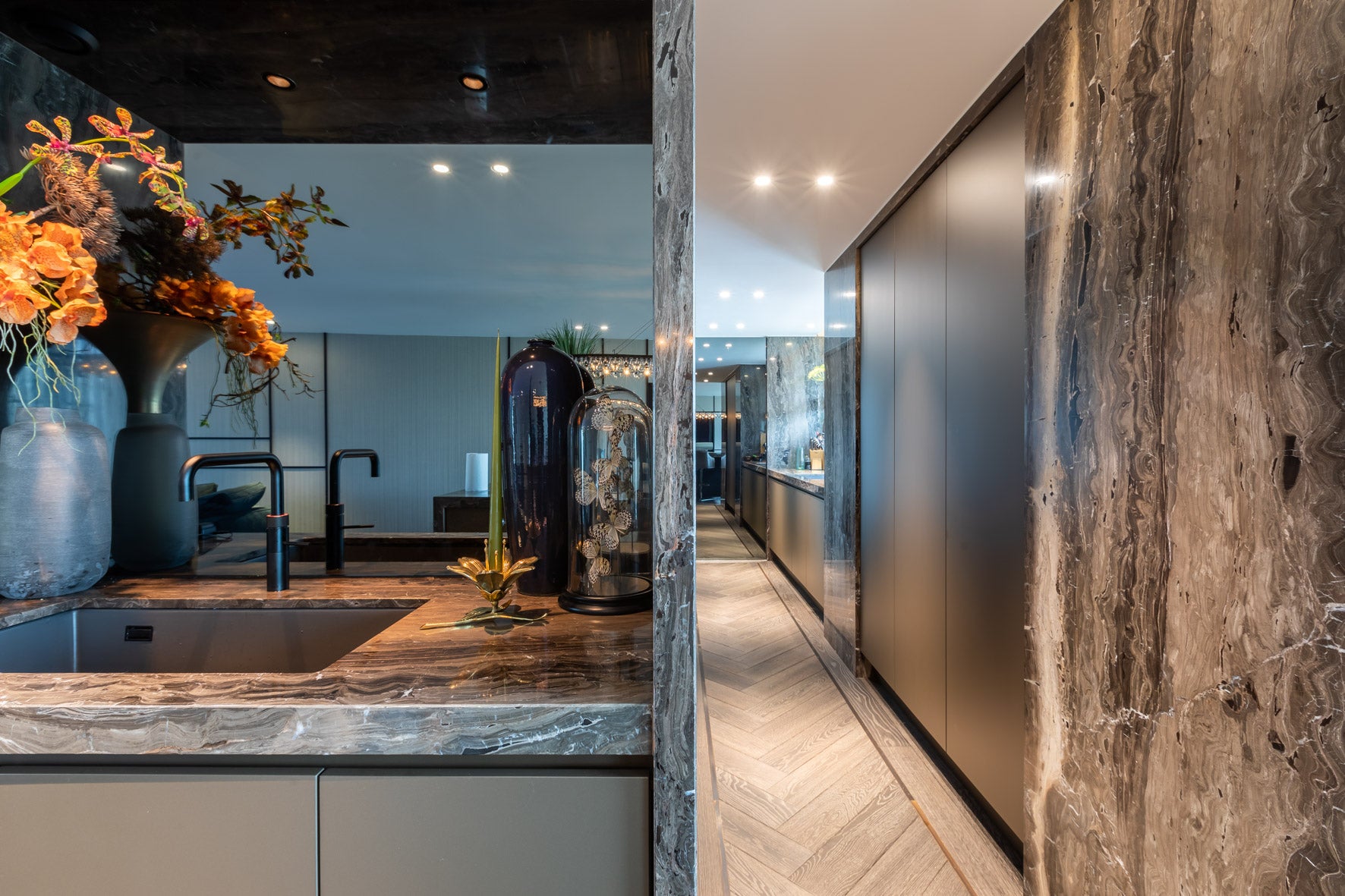 Het werkHet werkblad, kookeiland en de verticale wandpanelen zijn naadloos uitgevoerd in Cappuccino-marmer, waardoor de ruimte een krachtige en harmonieuze uitstraling krijgt. De natuurlijke tekening van de steen loopt vloeiend door in alle vlakken, een detail dat vakmanschap en precisie in het zagen en plaatsen benadrukt. Door de warme kleurtonen vormt het marmer een elegant contrast met de donkere kasten en het lichte parket.