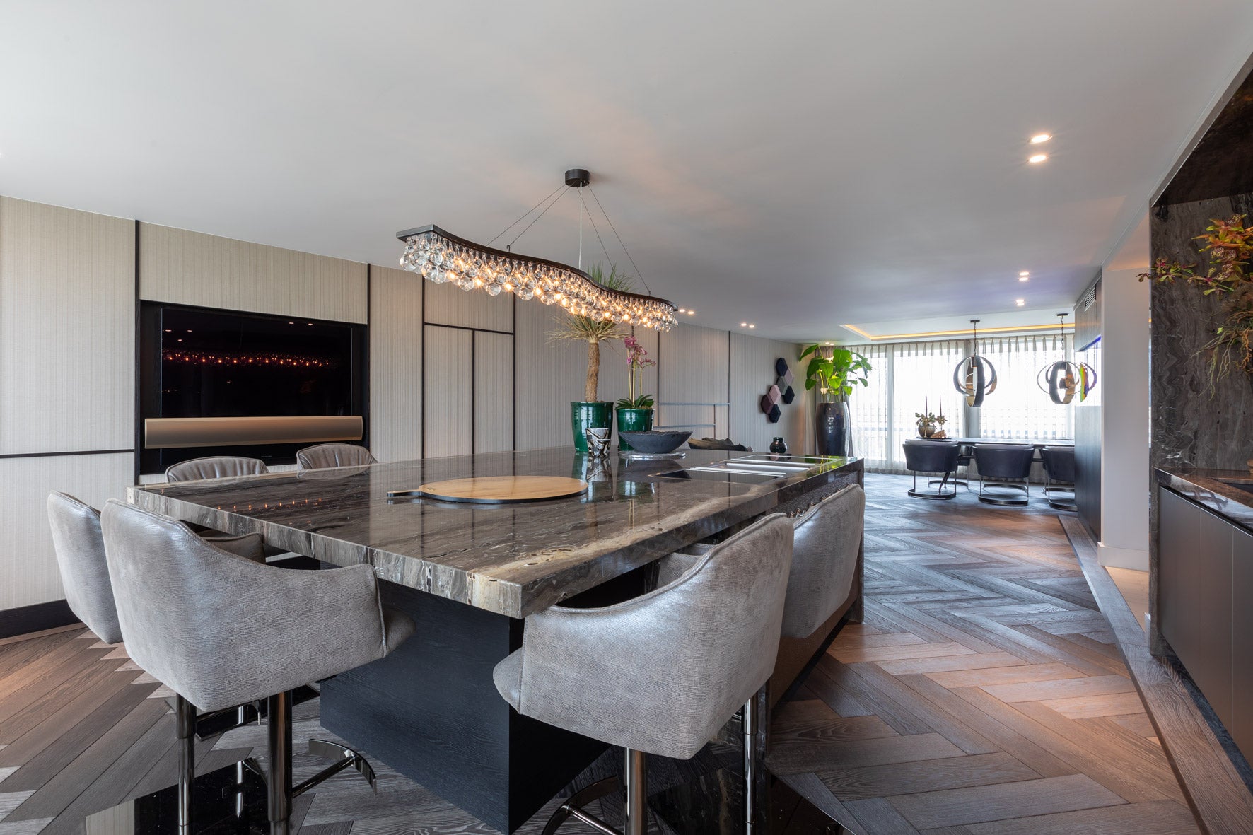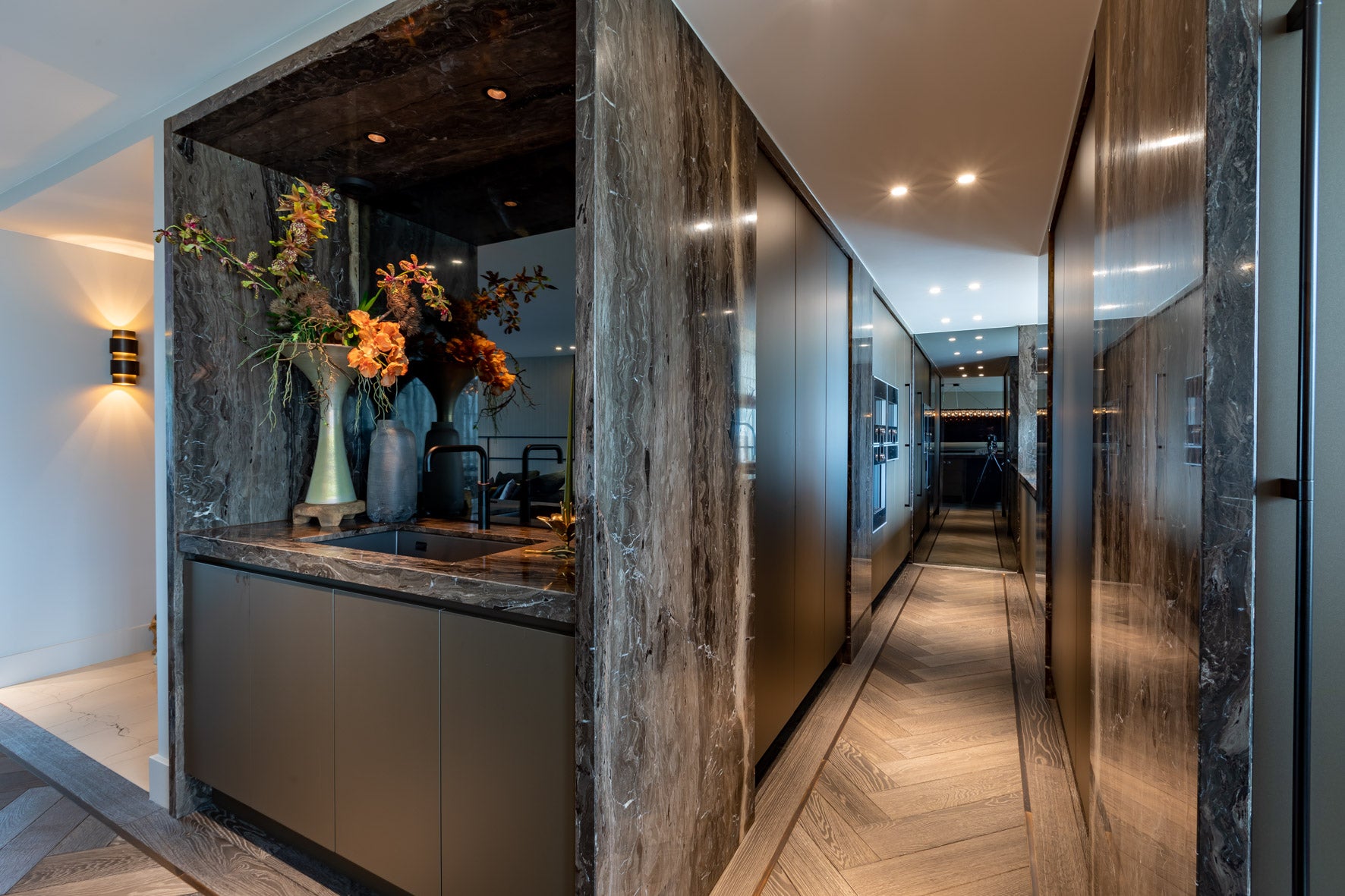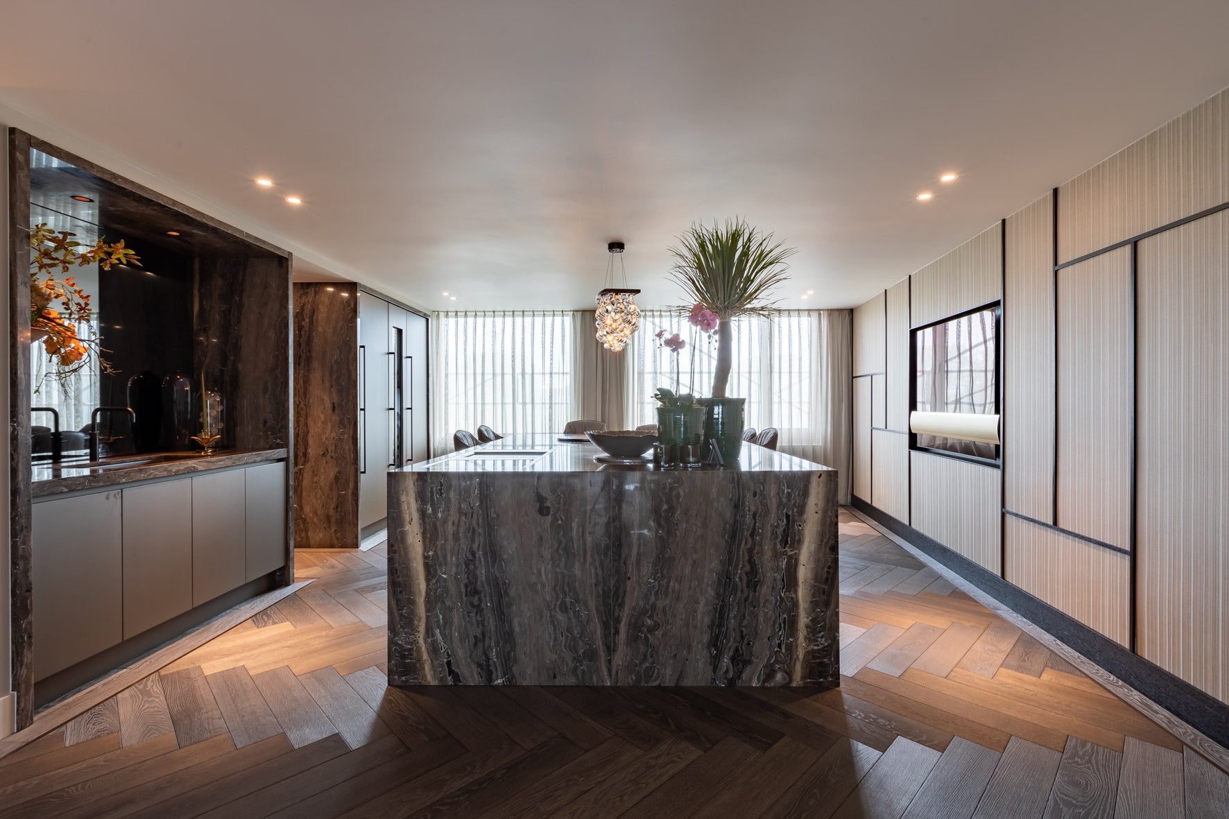 Voor dit penthouse in Amsterdam hebben we een royale keuken van 4 bij 6 meter volledig bekleed met Cappuccino-marmer, zorgvuldig geselecteerd op zijn warme schakeringen en rijke adering. Het resultaat is een verfijnde leefruimte waarin luxe, symmetrie en functionaliteit moeiteloos samenkomen.