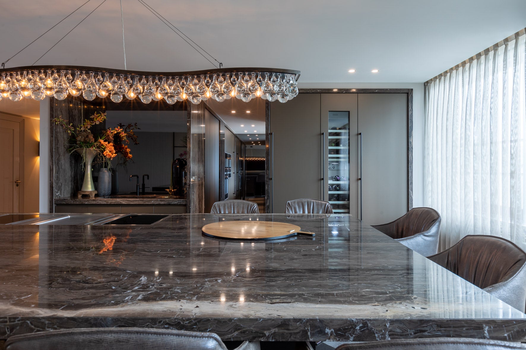 De royale keukenopstelling is ontworpen voor zowel esthetiek als gebruiksgemak, waarbij elk detail een doordachte balans tussen luxe en comfort weerspiegelt. Het imposante kookeiland fungeert als middelpunt van de ruimte en nodigt uit tot samenzijn en culinaire beleving. Dankzij de duurzame eigenschappen van marmer is deze keuken niet alleen een visueel statement, maar ook een investering die generaties lang meegaat.