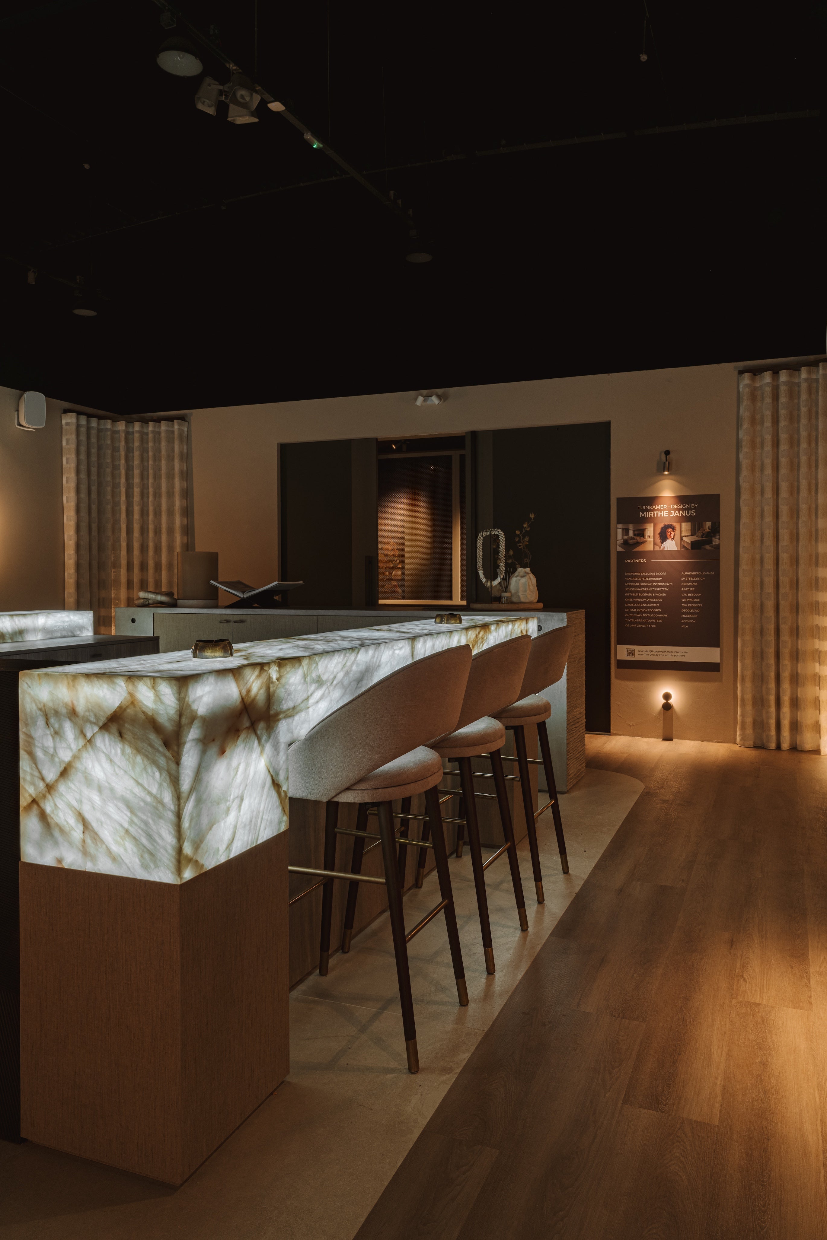 Voor deze exclusieve bar selecteerden we zorgvuldig Cristallo Beige, een halftransparante kwartsiet die zich perfect leent voor verlicht natuursteen. Door de platen van achteren te voorzien van hoogwaardige LED-panelen, ontstaat een warme gloed die de natuurlijke adering benadrukt.
