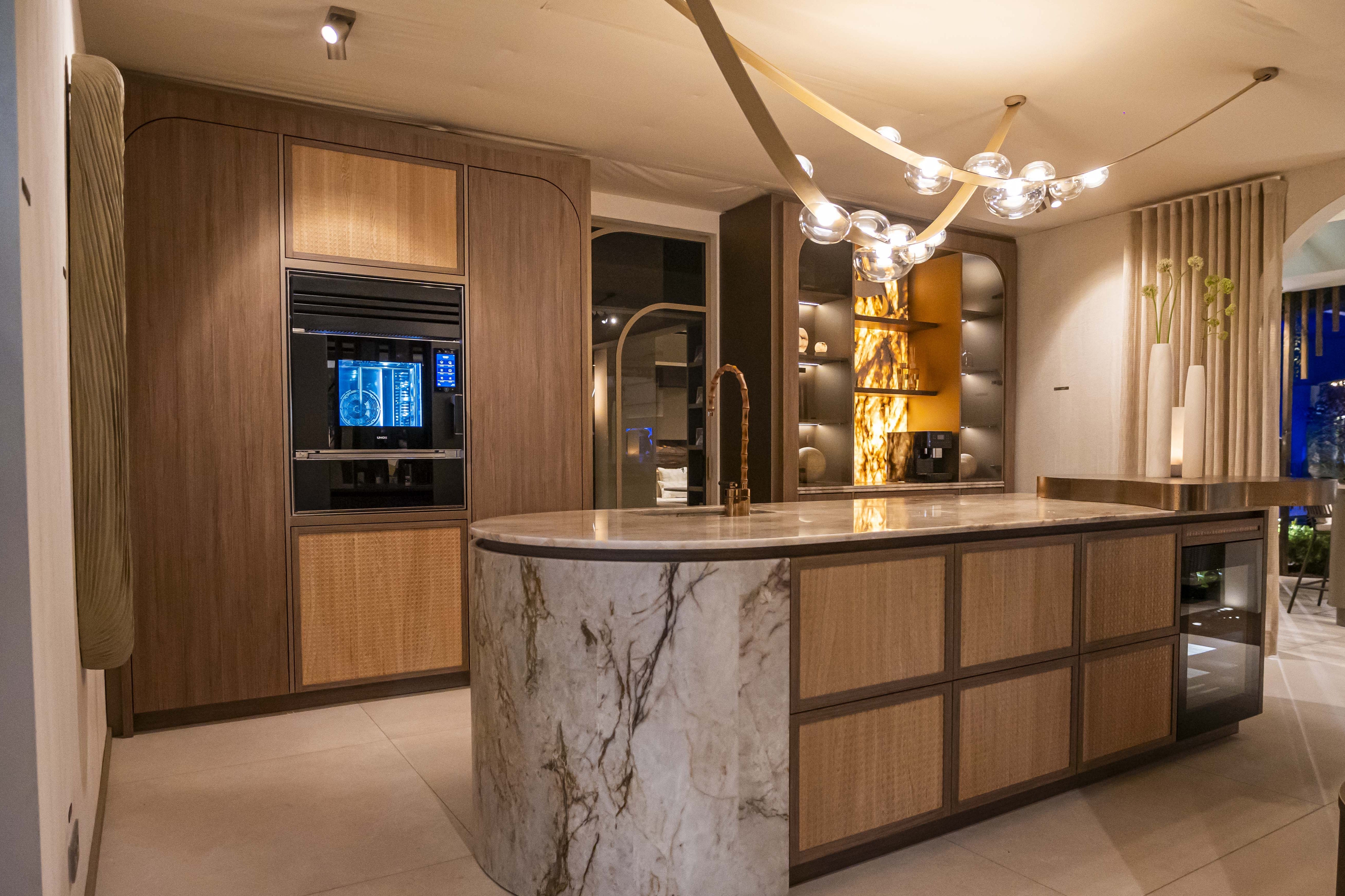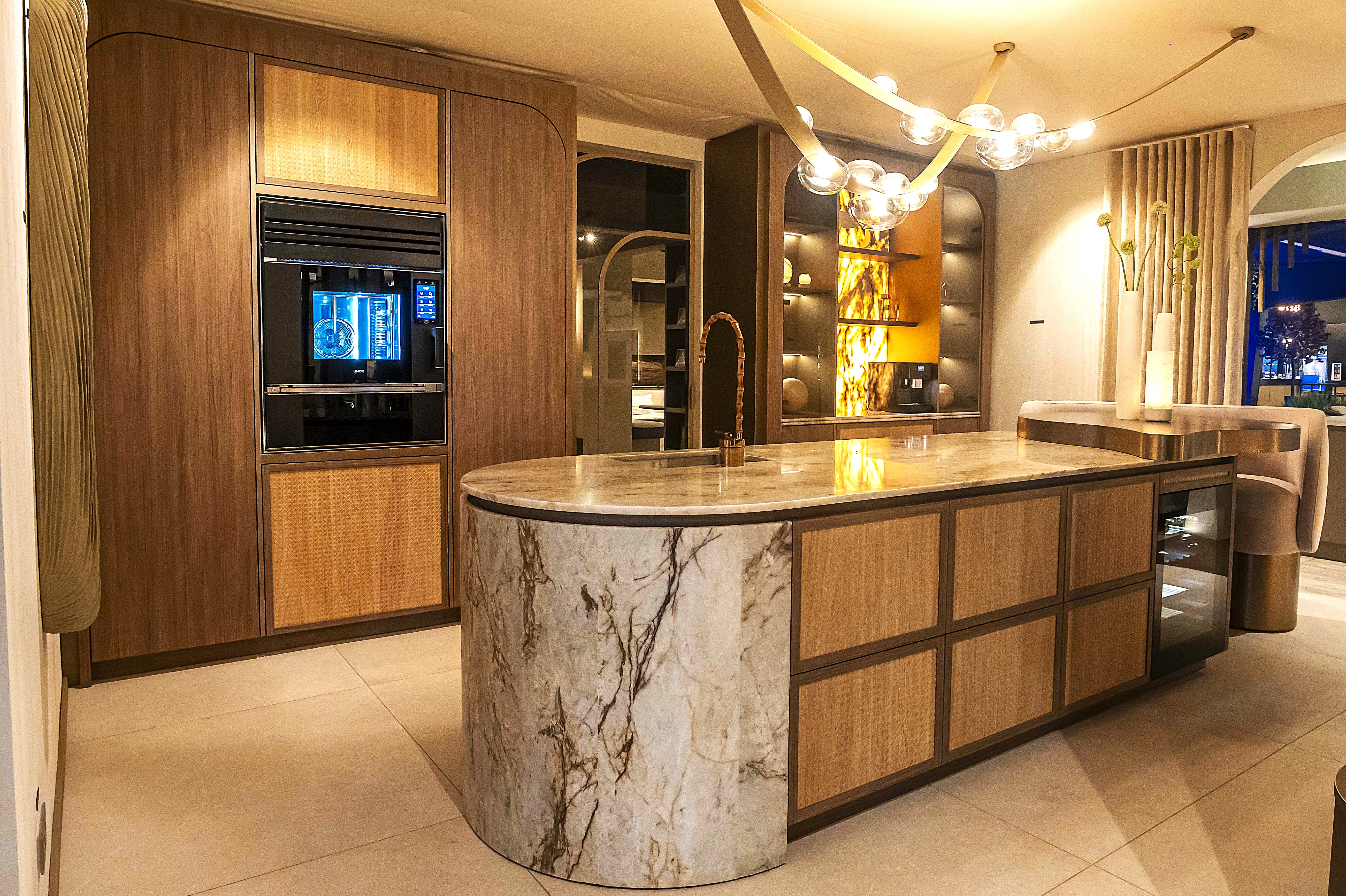 Voor dit exclusieve project is gekozen voor Cristallo Solaris, een zeldzaam kwartsiet met een prachtige goudbruine adering en lichte, semi-transparante delen. Het royale keukeneiland, met afgeronde hoeken en een verfijnde randafwerking, vormt het hart van de ruimte. De fronten in natuurlijke houttinten sluiten naadloos aan op de warme nuances van het steen.