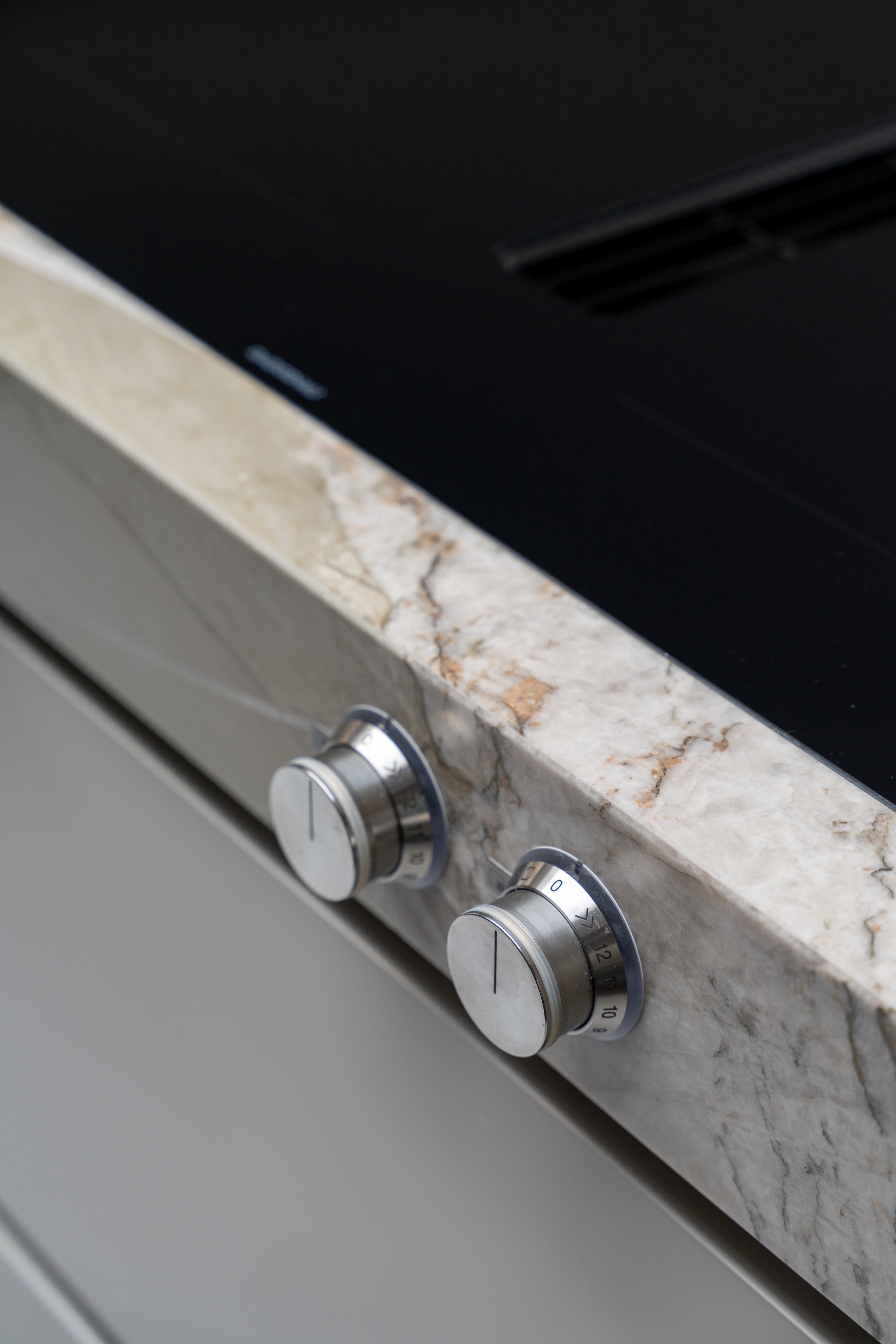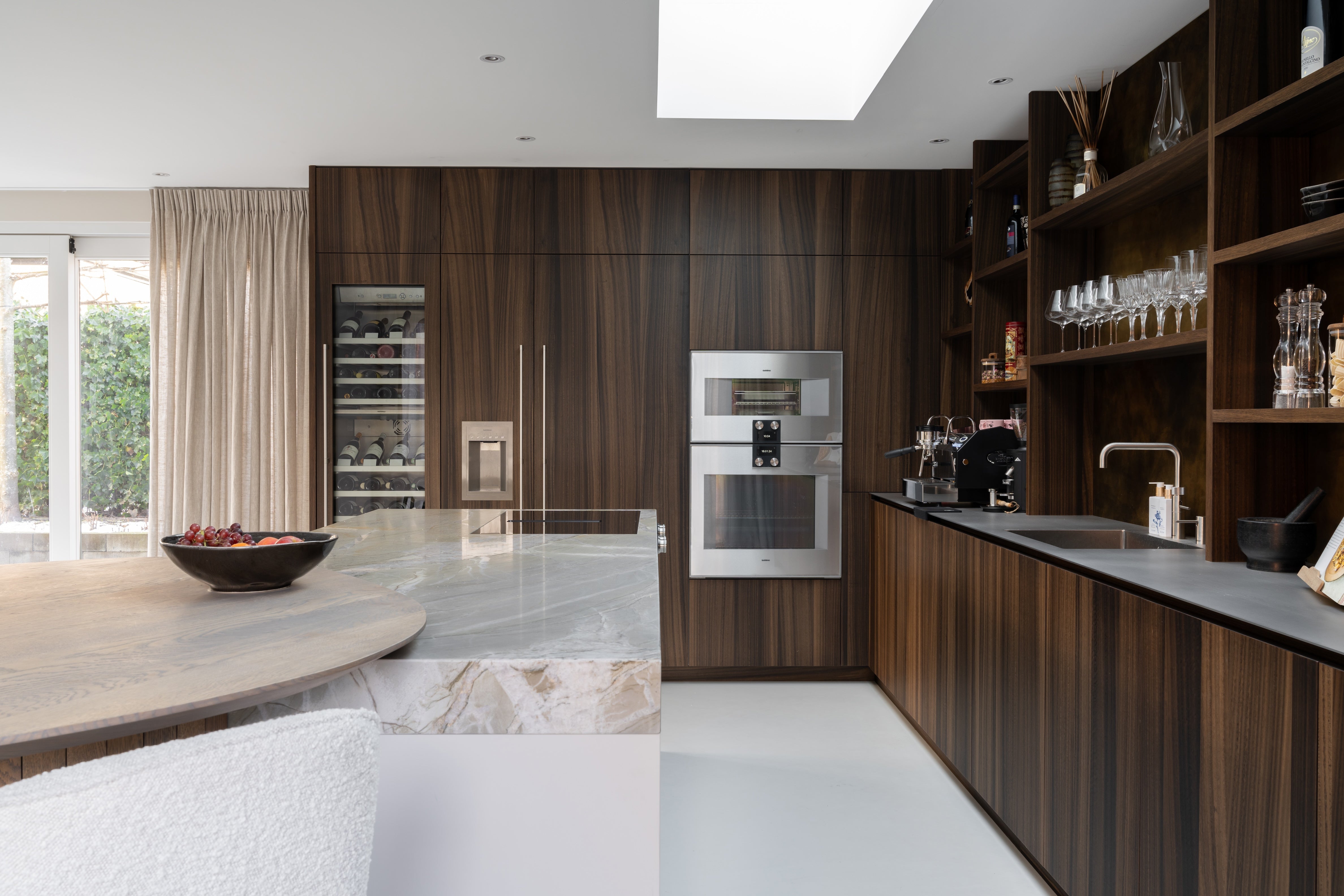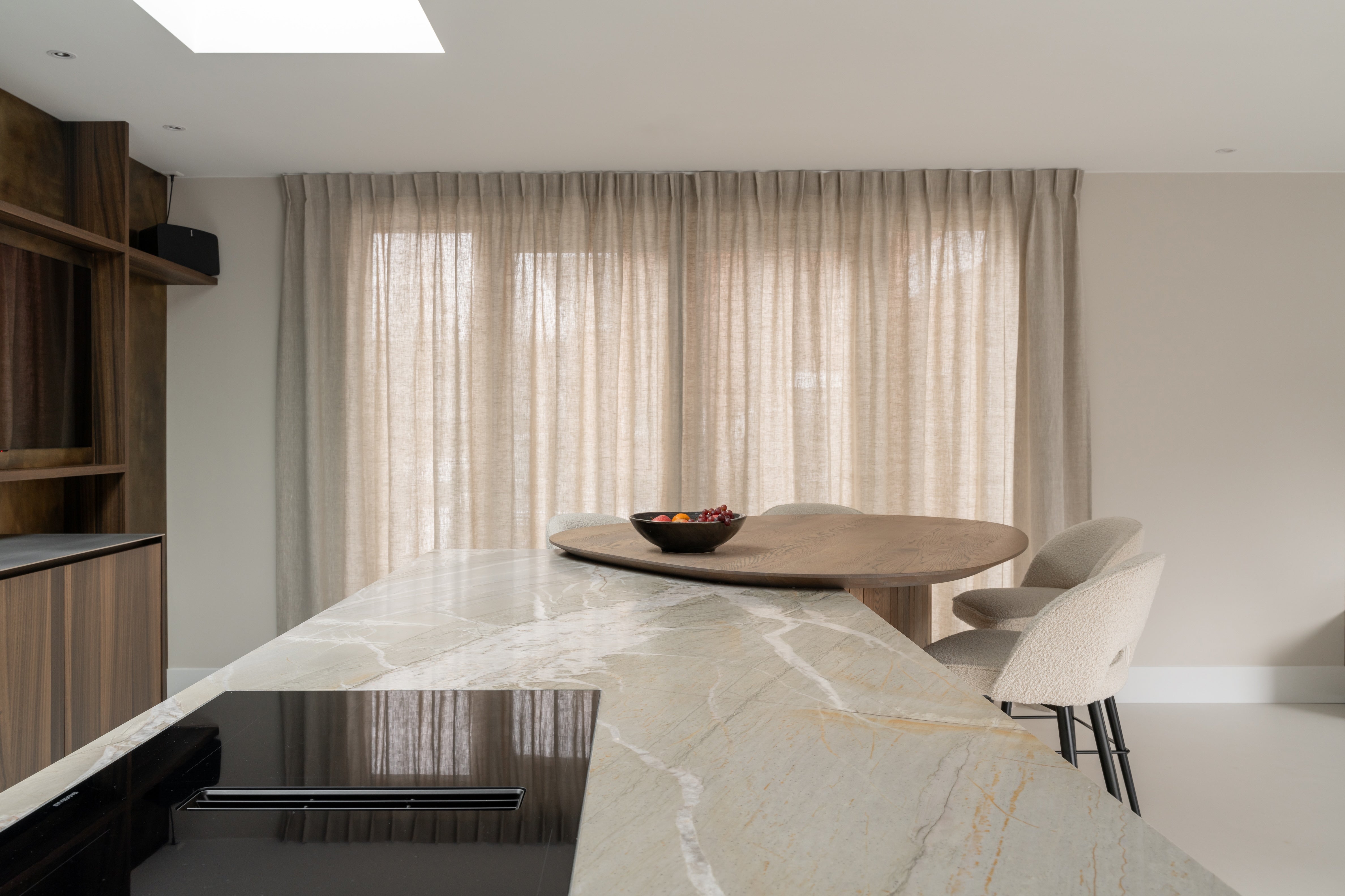Een elegante keuken met Mystique kwartsiet, ontworpen door Studio Broersen.