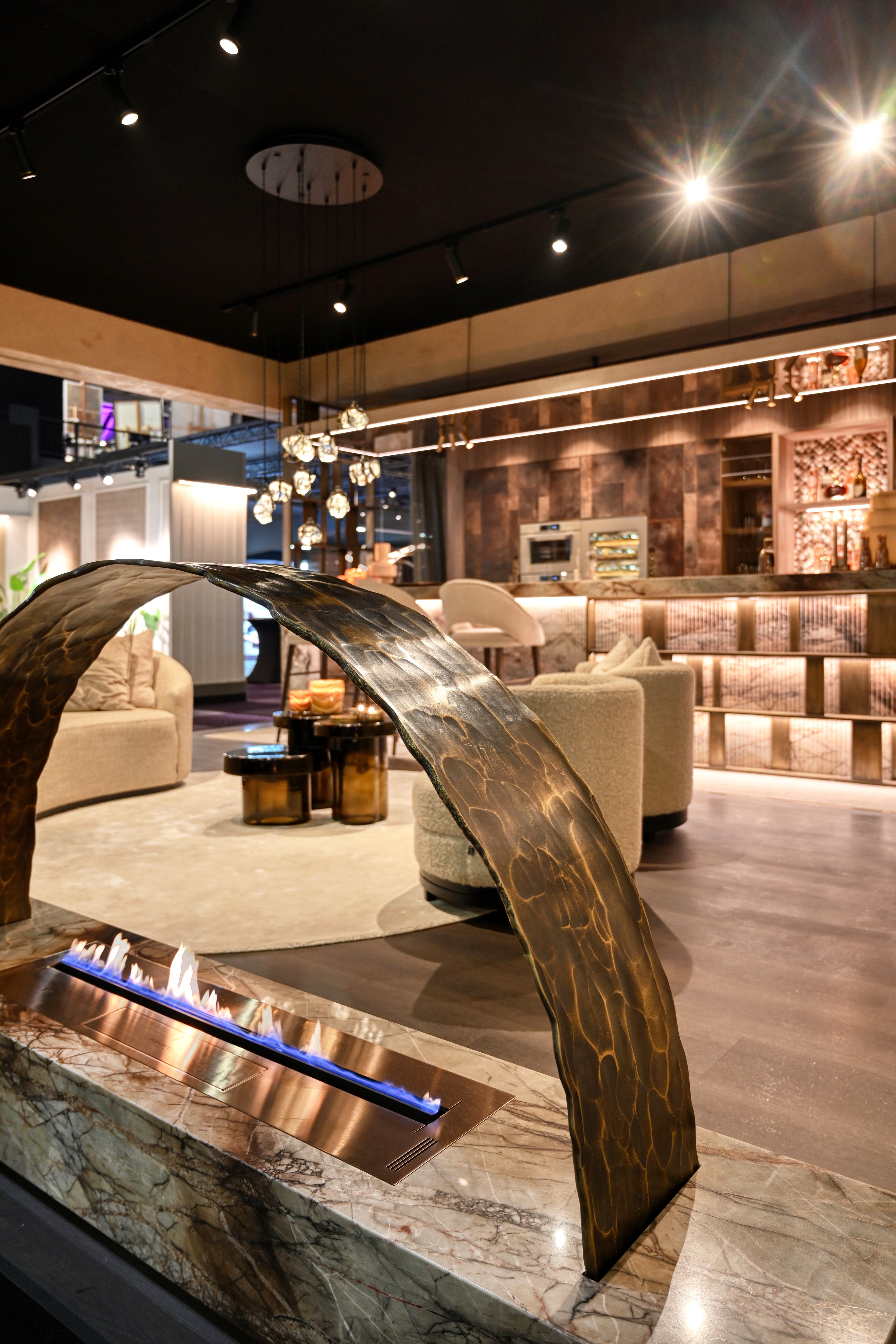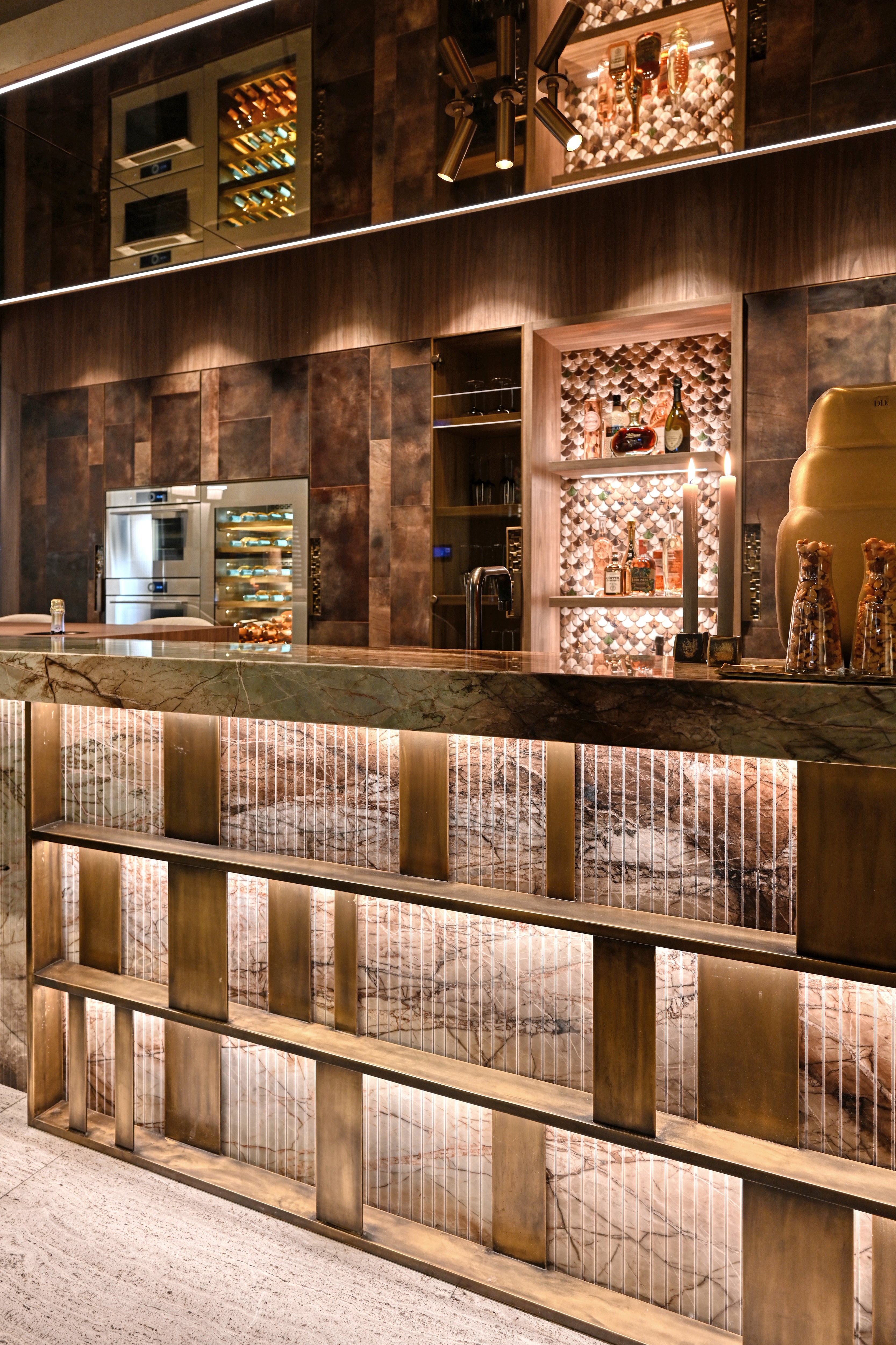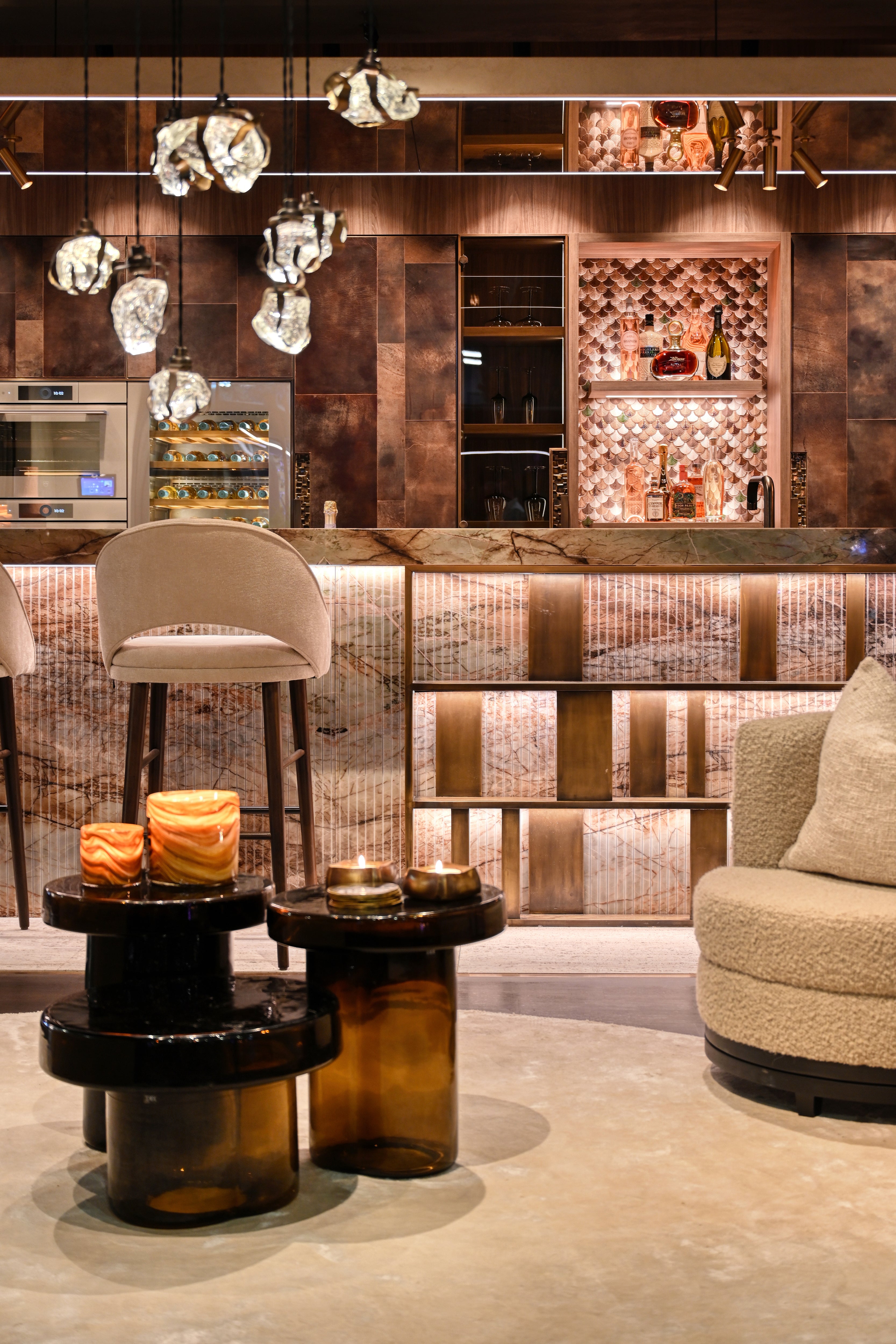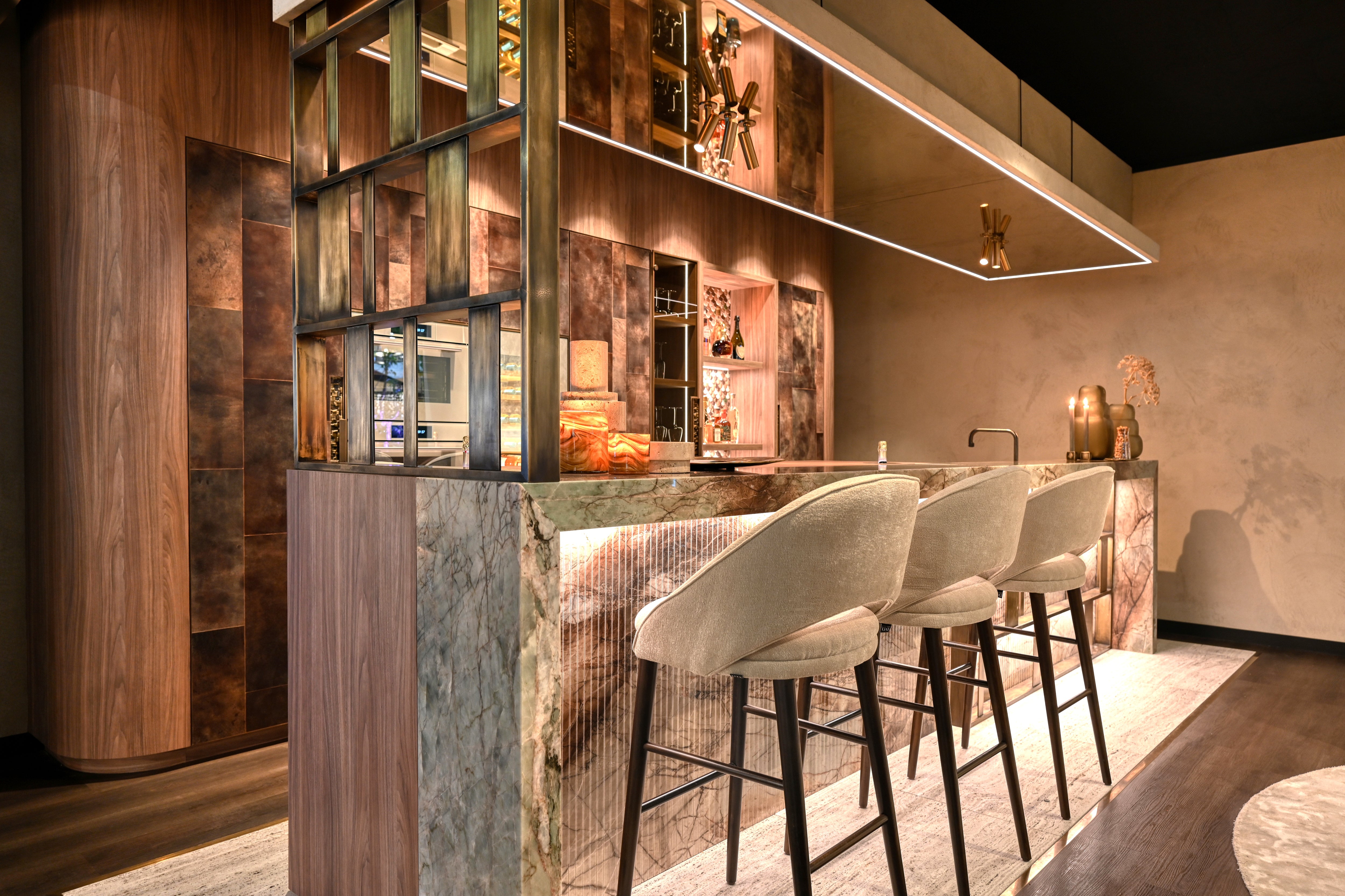 Het Nomade Kwartsiet is toegepast in de bar, open haard en wandafwerking, waardoor een harmonieus geheel ontstaat dat zowel verfijnd als stoer oogt. Deze compositie laat zien hoe natuursteen niet alleen functioneel, maar ook kunstzinnig en emotioneel kan bijdragen aan een interieur.